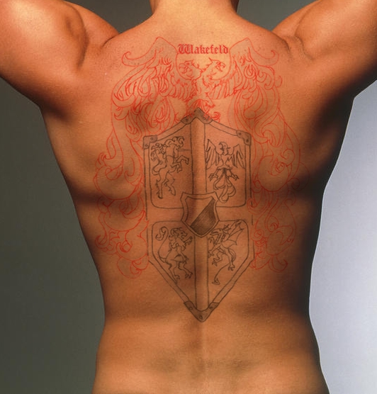 It was beautiful, taking up from about 3 inches below the base of his neck to almost his hips in size. It was a striking double-headed phoenix sitting atop an old-style crested shield, with the four sections of the shield each holding a symbol. Top left was a unicorn, top right was a phoenix, bottom left was a lion, and bottom right was a dragon. Each one was poised for attack, stunning in their fierce stances. In the center of the shield was a smaller shield that was half shaded in a diagonal direction, and all down the sides of the large shield, the dual-headed phoenix’s wings flowed like a waterfall. The last bit of the tattoo was an old English style writing of the name ‘Wakefeld’.
