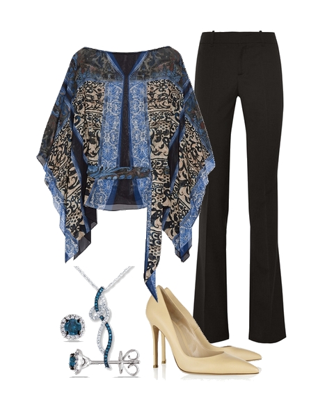 He is holding a black velvet case with a gold logo out to me in both his hands, so I carefully lift the lid. Nestled inside is an earring and pendant set in blue and white diamonds. The earrings are blue diamond studs with a small circle of white diamonds surrounding them. The pendant is on a delicate-looking chain, a single line each of blue and white diamonds weaving around and through each other.