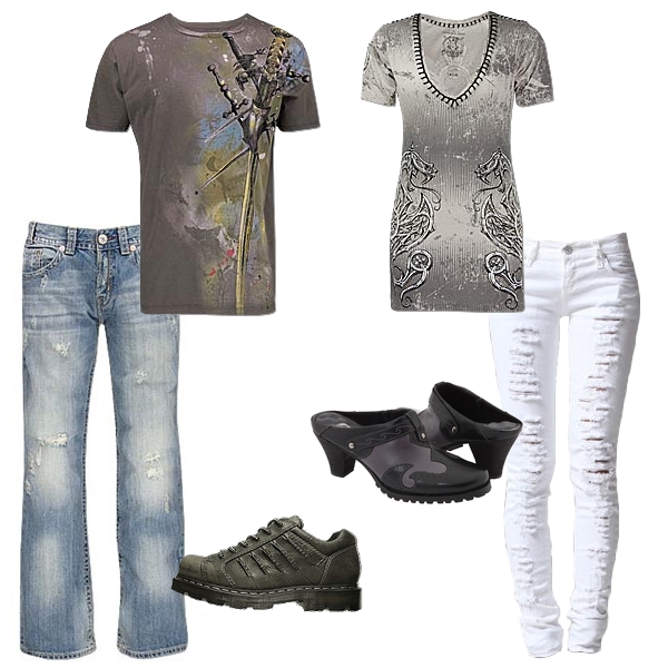 I take a chance to see everyone is indeed in jeans. Sulpicia’s are blue skinny, Aro’s are black, Marcus’ are a deep blue that look almost like they have a ‘dirty wash’ tint, and Caius’ are a faded light blue that are heavily distressed. Sulpicia is wearing a mock wrap top that has a slightly oriental vibe to the pattern, Aro’s shirt is a deep grey, Marcus’ is a blue that looks both bleached and splattered with blue paint, while Caius’ is an olive color accented by other colors and a graphic design. I am wearing my white slash skinny jeans with a black, white, and grey dragon graphic tee.
