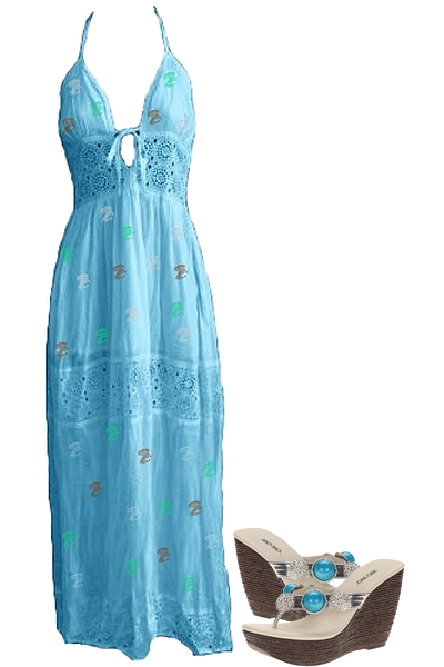 I started gathering the dress to slip it over my head, then looked down to see a really cute pair of slip-on wedge heels. The wedge part was wrapped in an earthy brown raffia, while the thong part was silver. It had silver sparkle circles and large circular blue gems. They were perfect with the dress. So cute.