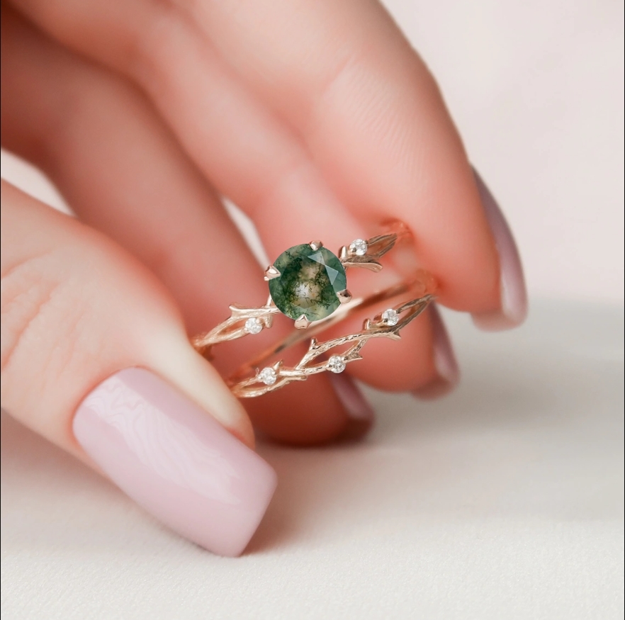 He shows me a ring, and my breathing hitches loudly in my throat as tears fill my eyes. The ring isn’t some gaudy piece that costs a year’s wages. It’s simple and beautiful, and just perfect because he listened. The main stone looks like threads of actual moss are inside it, and the band of the ring looks like interwoven gold twigs.