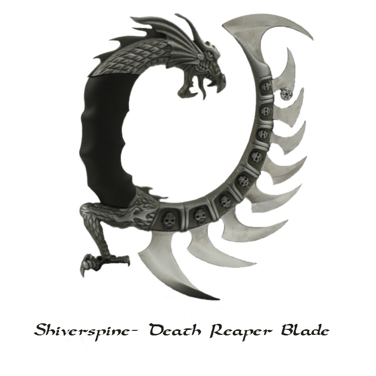 He picked up the next, which was a knife with a red and black blade as well as a detailed metal handle, then looked at the name. “This one’s ‘Demon Slayer’, and this one’s called ‘Shiverspine’.” The last one he picked up was shaped almost like a hollow circle. It had the head and spine of a dragon, with angled blades sticking out of the curved spine facing outward.