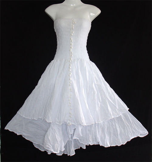 Sue disappeared into Bella’s closet, then came back a few minutes later with a strapless white gauze dress that smocked from the top to the waist.