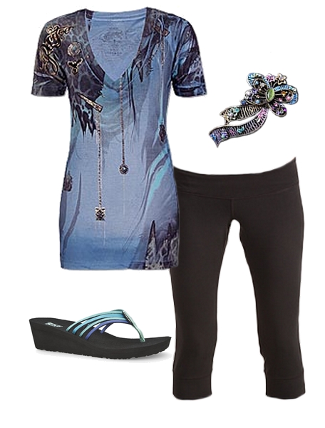 Peter and Major held up what they brought me from my closet, smiling proudly. Major was holding a teal and black unlined pinstripe bra/boyshort set in one hand, with a Remetee ‘Curtain’ t-shirt in the other hand. Captain was holding black wedge flip flops in one hand, as well as charcoal Patagonia ‘Tranquil’ capri leggings in the other. I beamed at them, “Thank Christ… I don’t think I could handle another corset today. I love them to death, just not when I’m expecting my cycle. You did a perfect job. Thank you.”