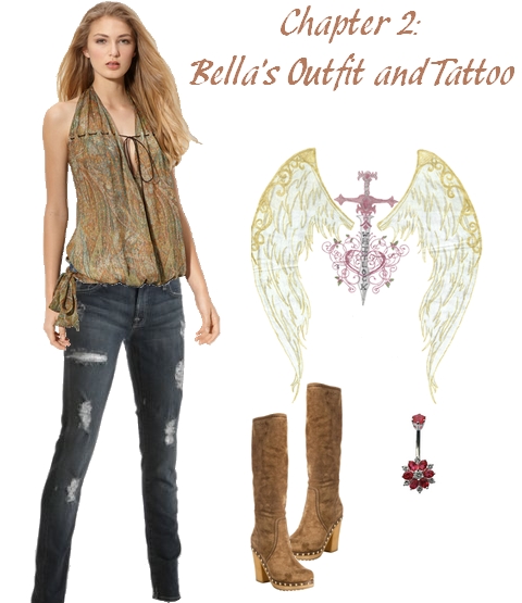Two hours later, my navel was re-pierced, plus my tattoo was complete and covered in a clear protective wrapping. Alice was handing me a change of clothes. It was a Haute Hippie silk halter, 7 For All Mankind ‘Roxanne’ destroyed skinny jeans, and Car Shoe studded detail tan boots. I smiled widely, “Awesome. Derrick, do you have a restroom I can change in? I can’t wait to get out of these stuffy ass clothes.”