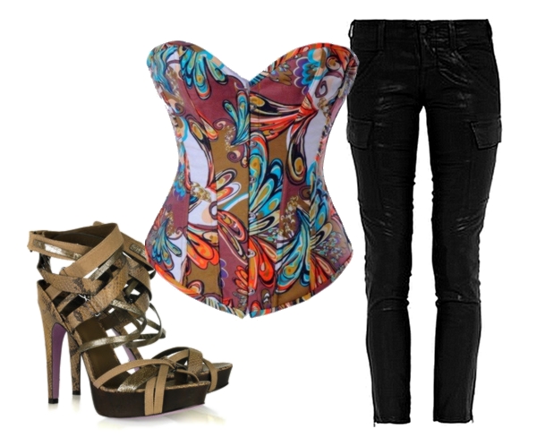 When we came back out to the bedroom, the bed was already made. Alice had laid out the perfect outfit for me. It was a wild printed and multi-colored corset, with black tight-lacing in the back. It had a matching low-rise thong. She had paired the set with a pair of desert tan leather and snakeskin strappy heels, along with a black pair of J Brand ‘Houlihan’ skinny cargo jeans.